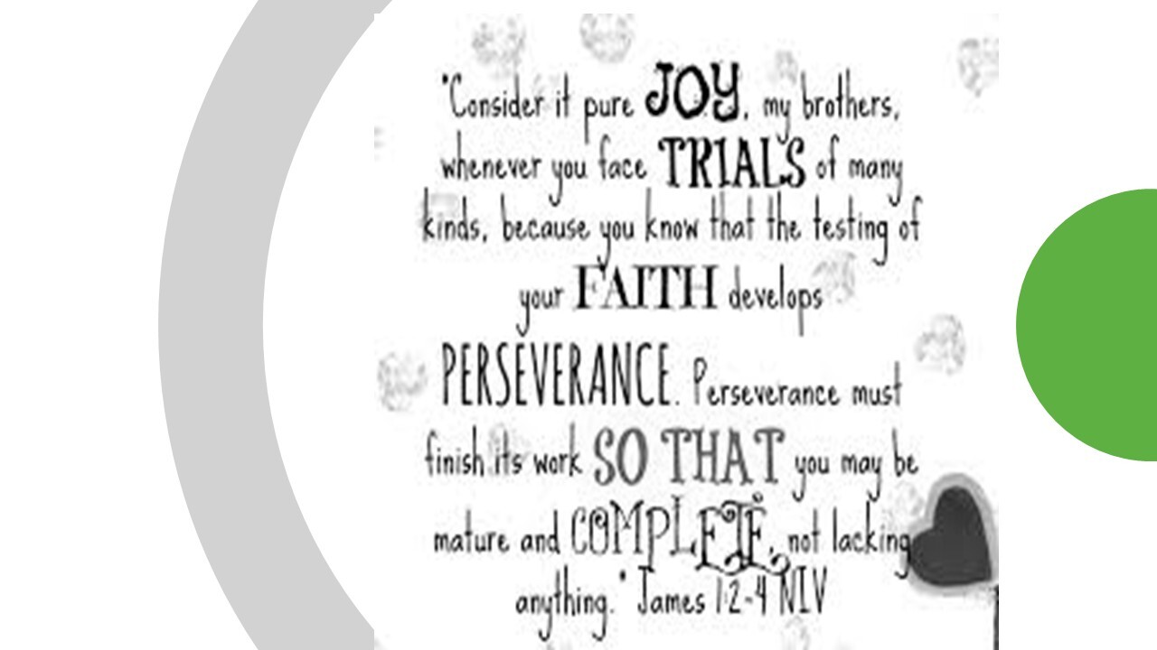 Consider it pure joy, my brothers and sisters, whenever you face trials of many kinds, because you know that the testing of your faith produces perseverance. Let perseverance finish its work so that you may be mature and complete, not lacking anything. (James 1:2-4 NIV)