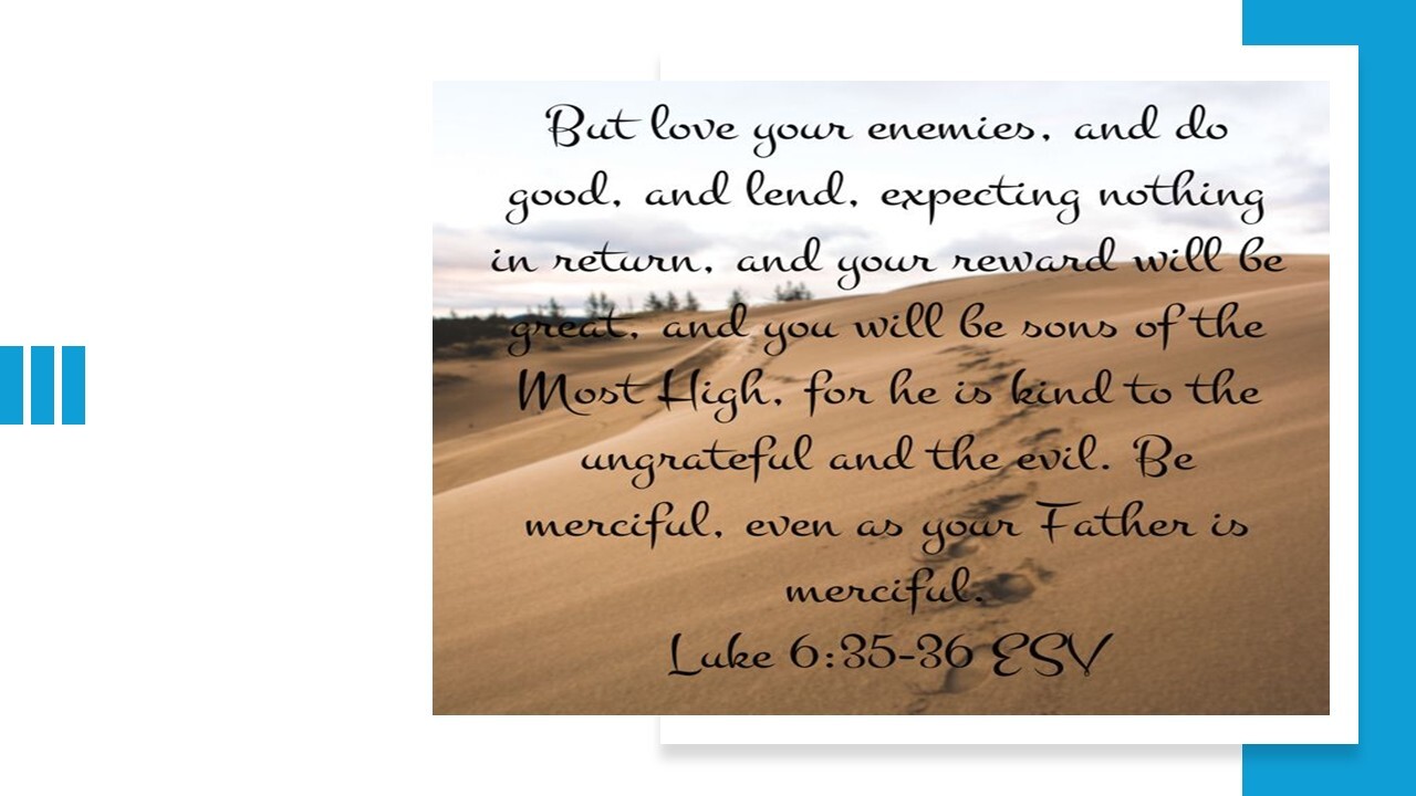 Love your enemies. Do good to those who hate you. Ask God to bless the people who ask for bad things to happen to you. Pray for the people who are mean to you. If you do this, you will have a great reward. You will be children of the Most High God. God is good even to the people who are full of sin and not thankful. Give love and mercy the same as your Father gives love and mercy. (Luke 6:27b-28, 35b-36 ERV)