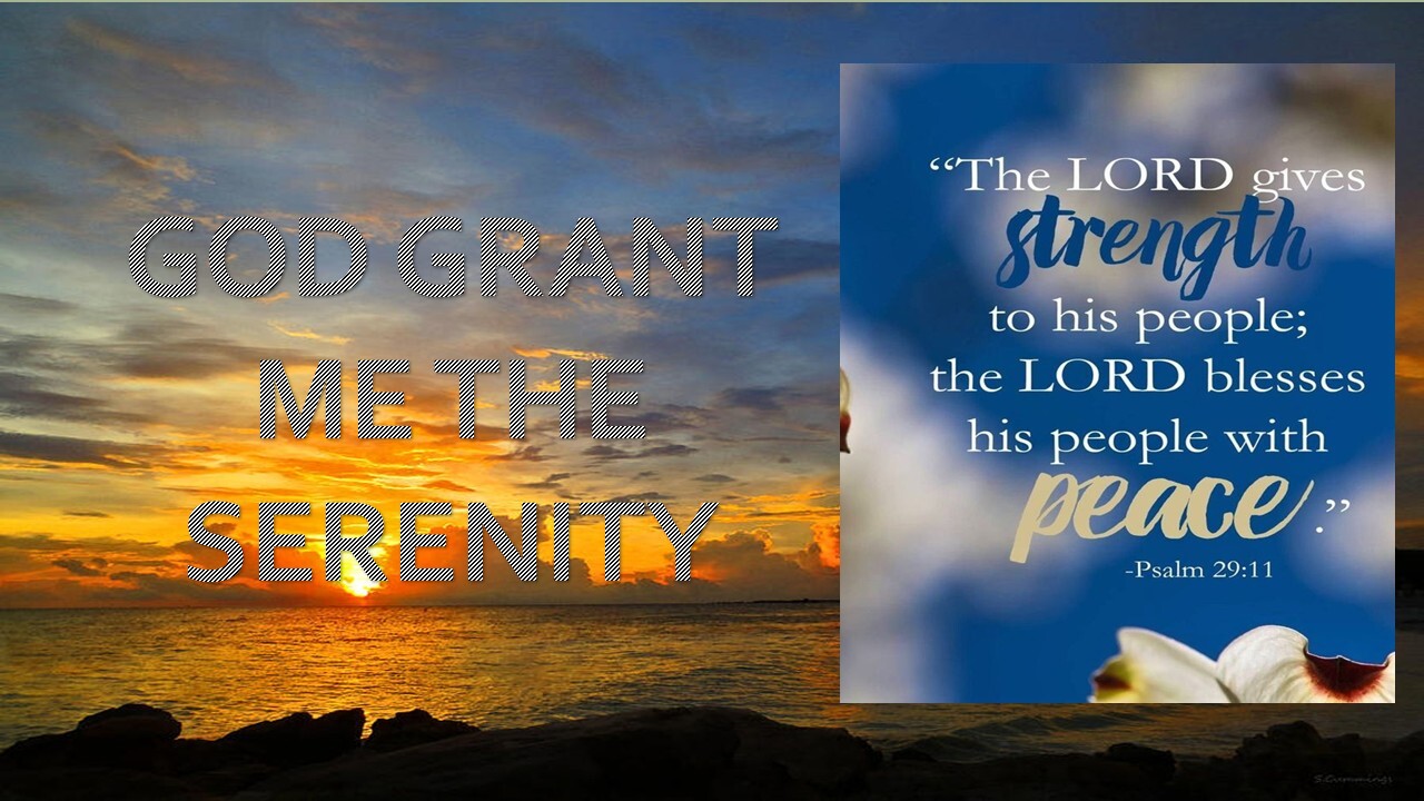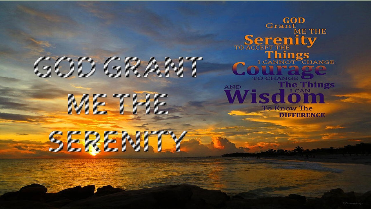 Prayer: God, grant me the serenity to accept the things I cannot change, the courage to change the things I can, and the wisdom to know the difference. Living one day at a time, enjoying one moment at a time; accepting hardship as a pathway to peace; taking, as Jesus did, this sinful world as it is, not as I would have it; trusting that You will make all things right if I surrender to Your will; so that I may be reasonably happy in this life and supremely happy with You forever in the next. Amen