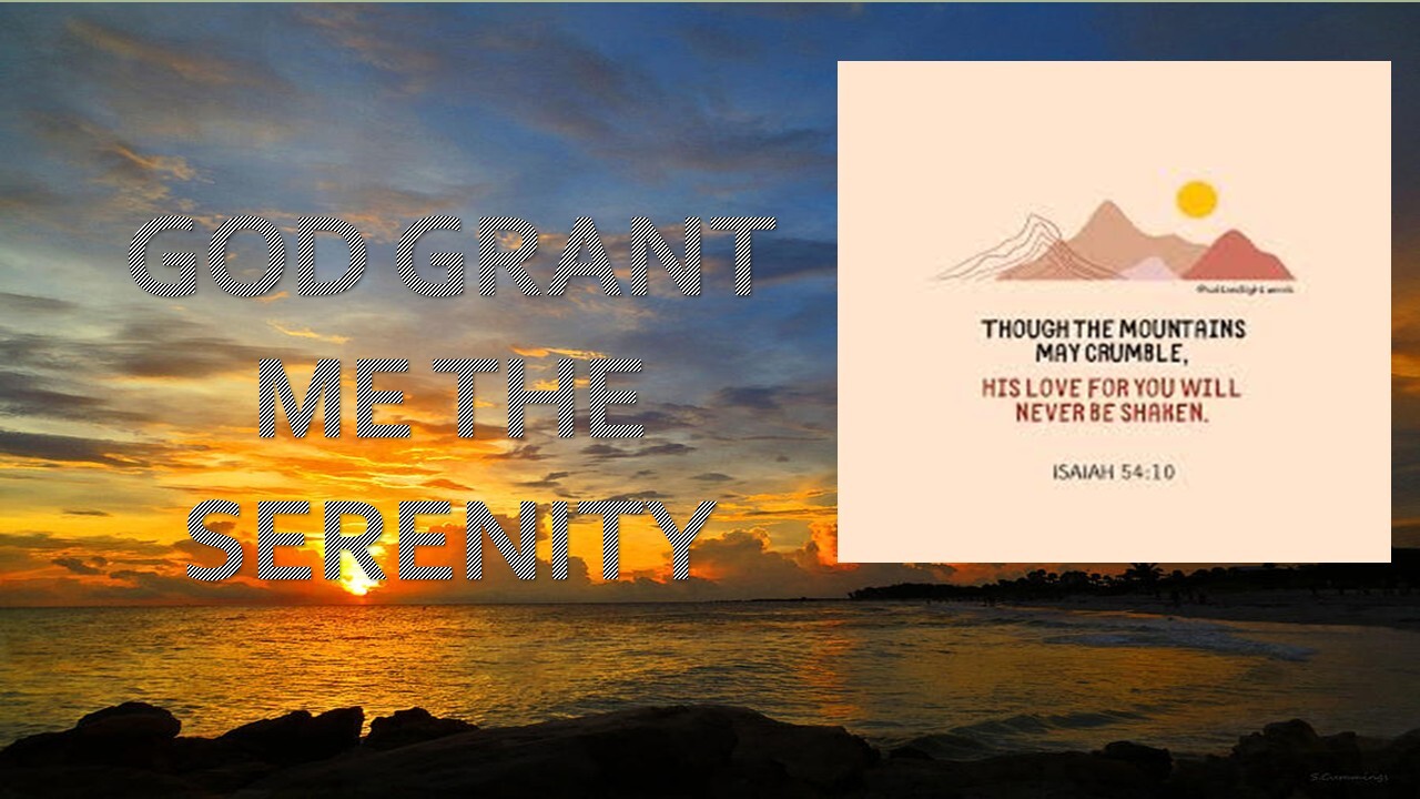 What comes to mind when we say or hear the word "serenity?" A smile? A longing? A regret? Serenity, for many, speaks of a sense of tranquility or inner calm. How do we find and maintain inner calm in the ups and downs of life? The serenity prayer suggests that we learn to be content with things that cannot be changed and take responsibility for change where it is possible.