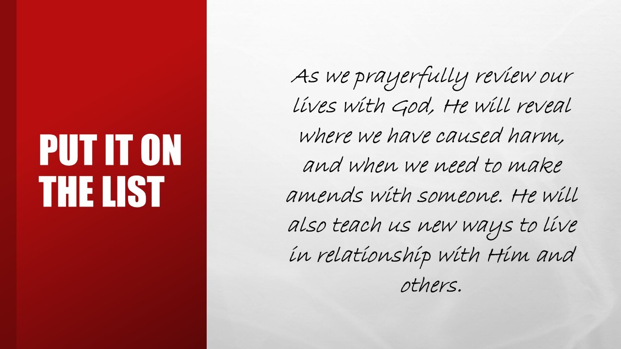 Little by little as we walk with God and work the steps, we gain new information about ourselves and how we relate to other people. As we prayerfully review our lives with God, He will reveal where we have caused harm, and when we need to make amends with someone. He will also teach us new ways to live in relationship with Him and others.