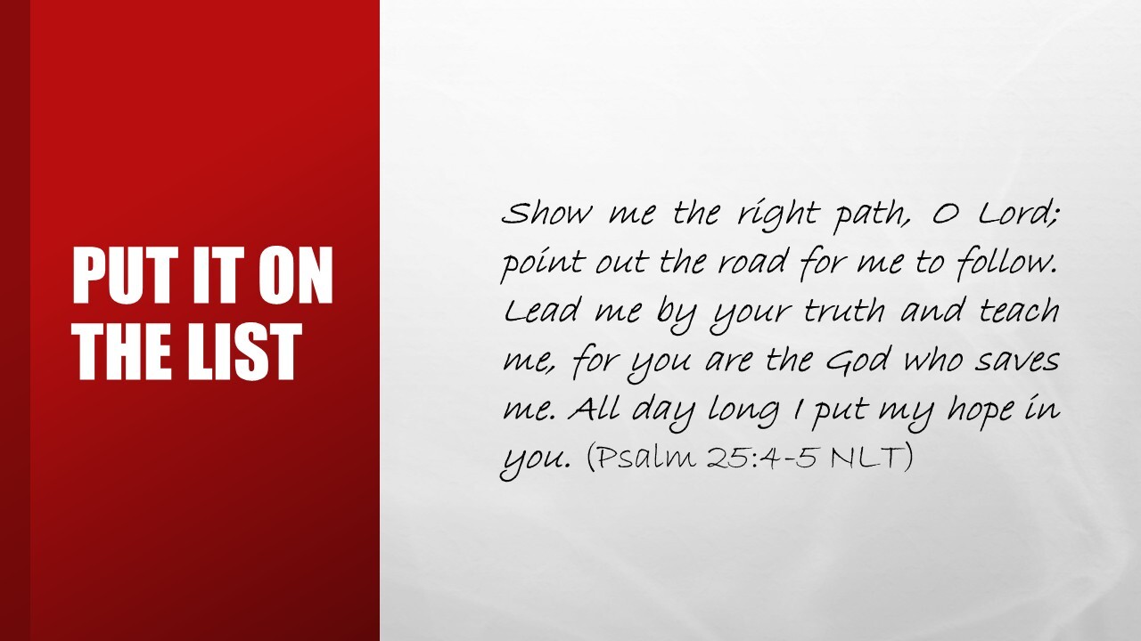 Show me the right path, O Lord; point out the road for me to follow. Lead me by your truth and teach me, for you are the God who saves me. All day long I put my hope in you. (Psalm 25:4-5 NLT)