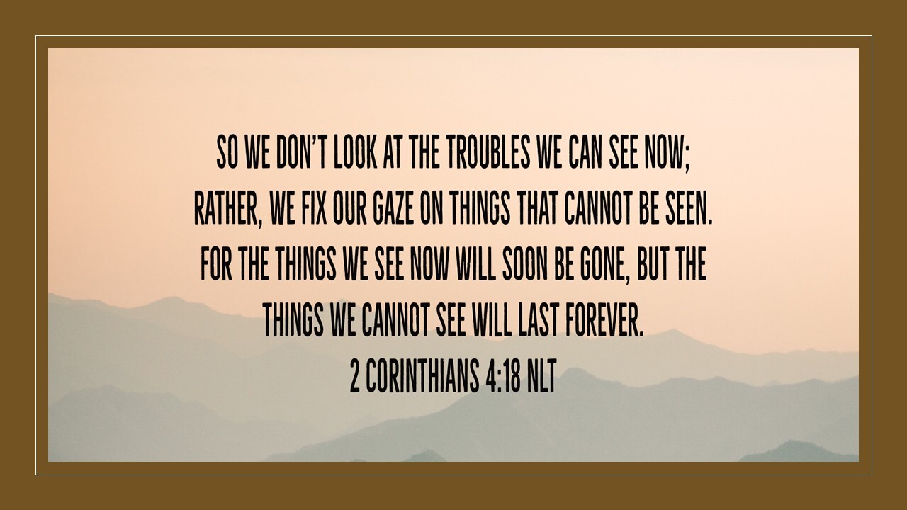This is the reason we do not give up. Our human body is wearing out. But our spirits are getting stronger every day. The little troubles we suffer now for a short time are making us ready for the great things God is going to give us forever. We do not look at the things that can be seen. We look at the things that cannot be seen. The things that can be seen will come to an end. But the things that cannot be seen will last forever. (2 Corinthians 4:16-18 NLV)